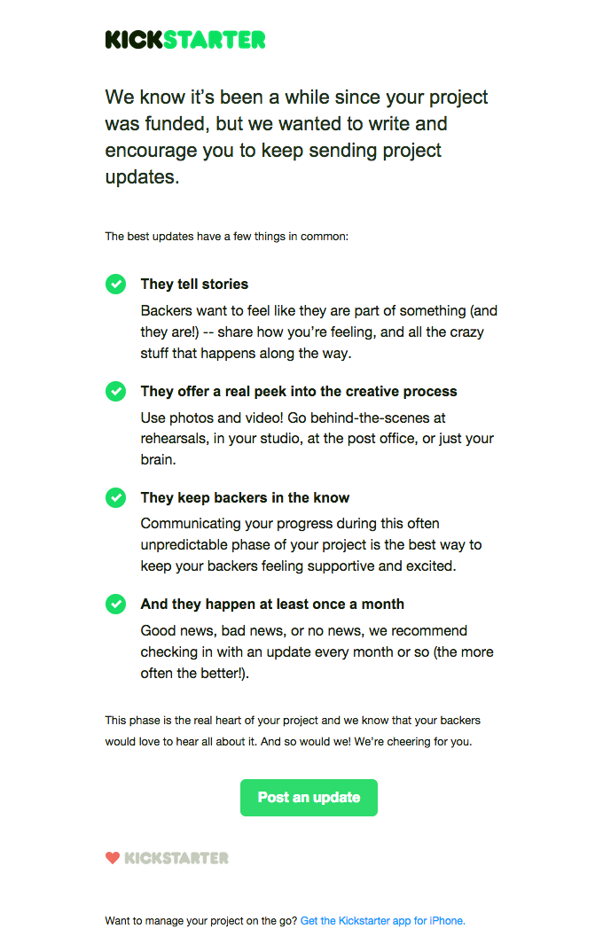 Kickstarter is great for getting funding for projects and ideas – but what happens after your idea is funded? To avoid people using the system once and leaving, Kickstarter sends this follow-up email when a user’s project is successfully funded. It not only provides tips and insights into what makes a successfully-funded project really shine, but also how to keep project backers in-the-loop.
