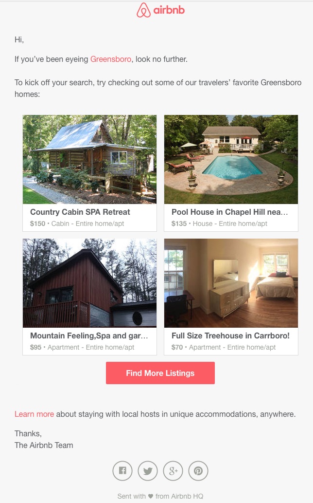 Been looking at a specific location on Airbnb? Expect to receive an email with top destinations at that location: