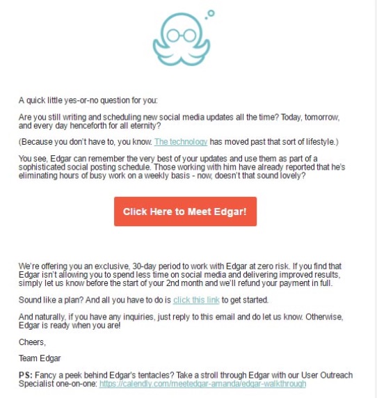 With your Outreach Specialist, you can then schedule a demo to see how the platform works. Further follow-up emails invite you to participate in a Getting Started webinar, and so on — demonstrating that Edgar has his tentacles in a wide variety of channels to make users feel more comfortable and empowered in how they manage social media.