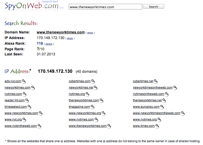 Dieses Tool ist sehr beliebt, weil es einfach zu nutzen ist. Du kannst eine URL, einen Google AdSense- oder Google Analytics-Code und eine IP-Adresse eingeben, um herauszufinden, ob diese zusammengehören. Wenn Du eine Domain eingibst, erhältst Du Ergebnisse für alle verschiedenen IP-Adressen und eine Liste mit Domains, die dieselbe IP-Adresse verwenden (in einigen Fällen hat eine Webseite mehr als eine IP-Adresse).