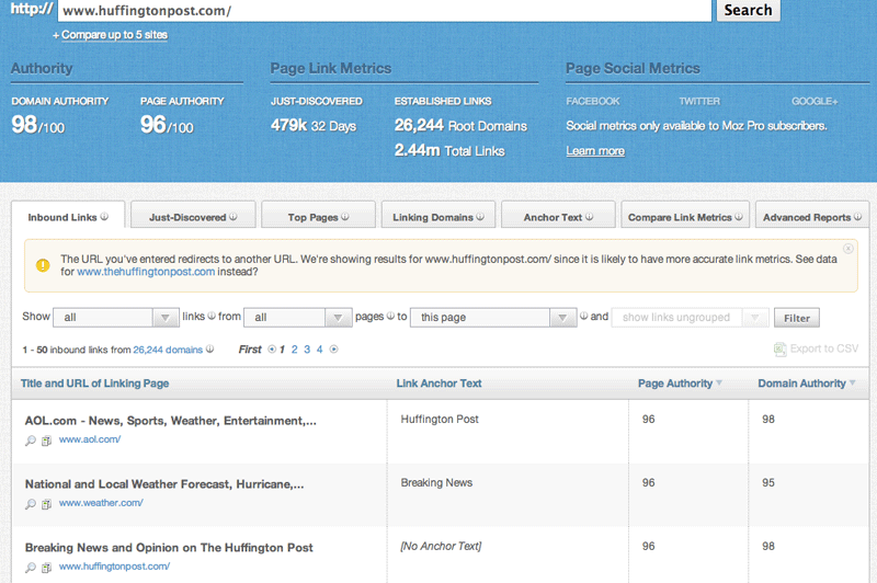 Der Link Explorer von Moz ist eines der beliebtesten Programme fürs Linkbuilding und zur Überwachung des Linkprofils Deiner Mitbewerber. Erfahre ihren PageRank, ihre Domain Authority und verwendeten Ankertexte. Du kannst verschiedene Linkdaten miteinander vergleichen. Dies erleichtert die Arbeit.