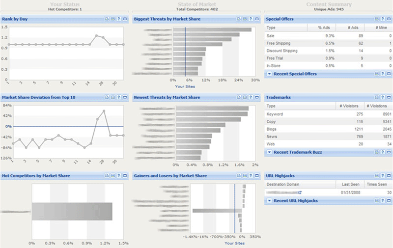 Dieses Tool ist zwar nicht so beliebt wie viele andere auf dieser Liste, bietet aber auch wertvolle Informationen. Es liefert ausschließlich Wettbewerbsdaten, außerdem kannst Du Unternehmen und Marken überwachen. Das Programm überwacht die Suchergebnisse auf Google, Bing, Yahoo, YouTube und Baidu, sowie Blogs, Webseiten, Foren, Nachrichten, Mobilgeräte und Shopping.