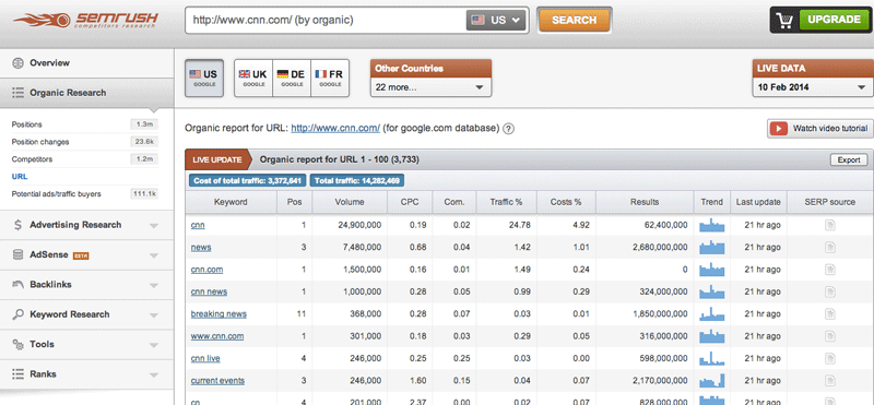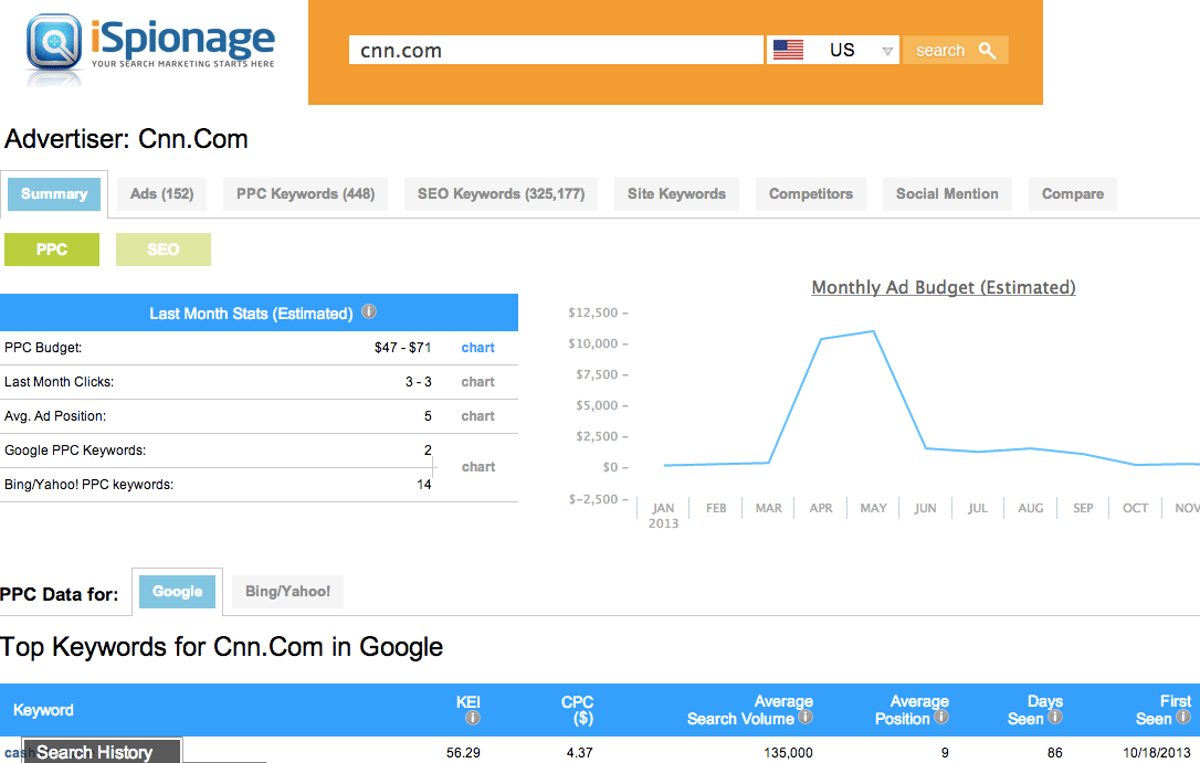 Dies ist ein weiteres Tool, mit dem Du Keywords überwachen kannst. Du gibst einfach einen Konkurrenten ein und bekommst dann seine leistungsstärksten Keywords sowohl für organische Suche als auch für PPC (Google und Bing) angezeigt und kannst sehen, wie viel der Konkurrent für die organische und die bezahlte Suche ausgibt. Du kannst die Anzeigentexte des Konkurrenten einsehen und bekommst Zugriff auf Diagramme, um alle Daten miteinander zu vergleichen.