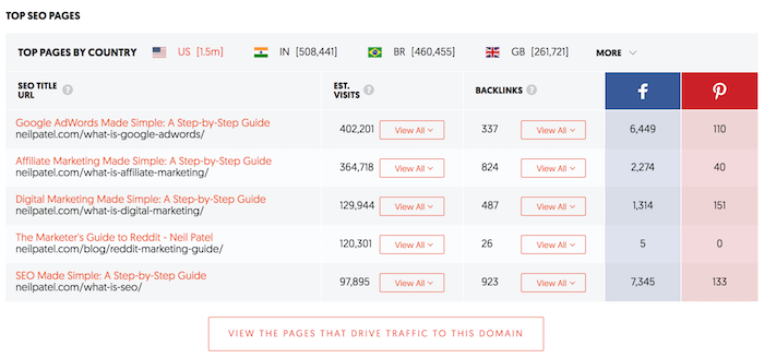 Aquí verás una lista de las páginas que hay en el sitio de tu competidor. Las que están en la parte superior son las páginas más populares y a medida que te desplazas por la lista encontrarás páginas que reciben menos tráfico.