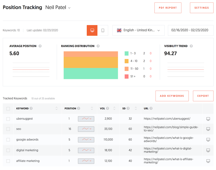 Y a medida que aumenten tus posiciones y tu tráfico, podrás ver tu desempeño en el panel de Ubersuggest.